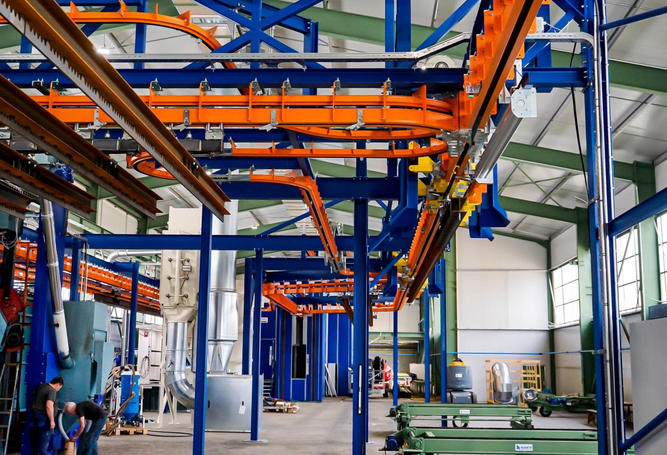 The overhead conveyor has a total track length of 243m and has a drop-section with a 15m long traverse to load the heavy products (up to 3000kgs) that Dugue handles. The oven and coating solutions were provided by ESTEE Coating Solutions. We are proud to work in close partnership with our trusted partners to ensure that we deliver to the customer's requests