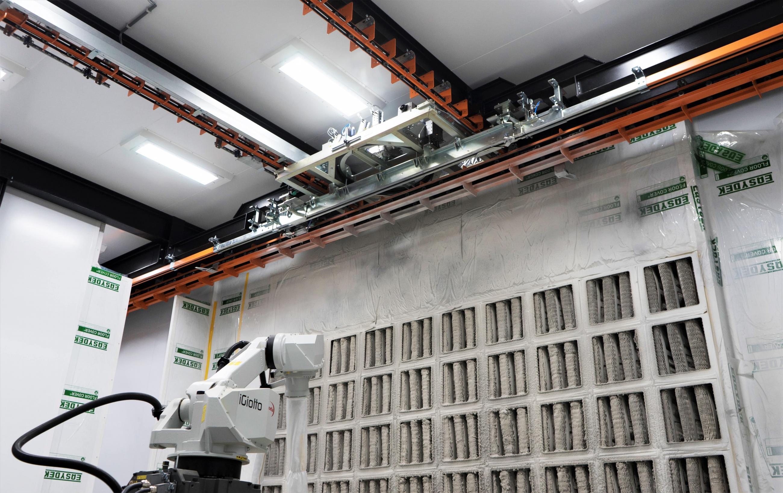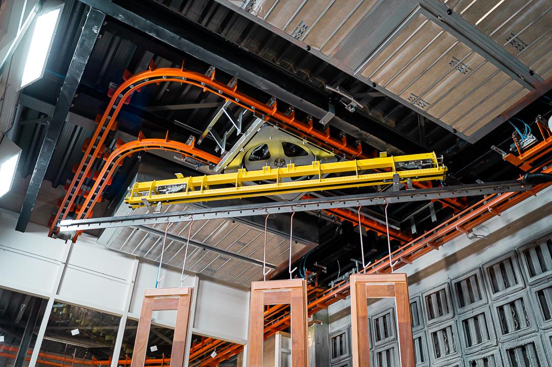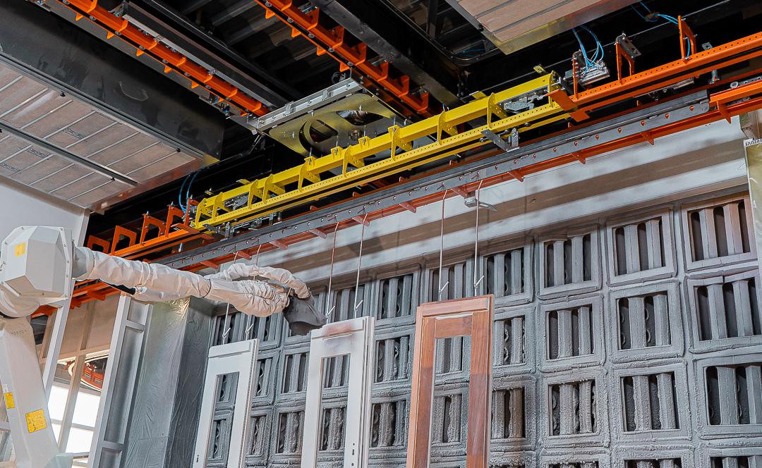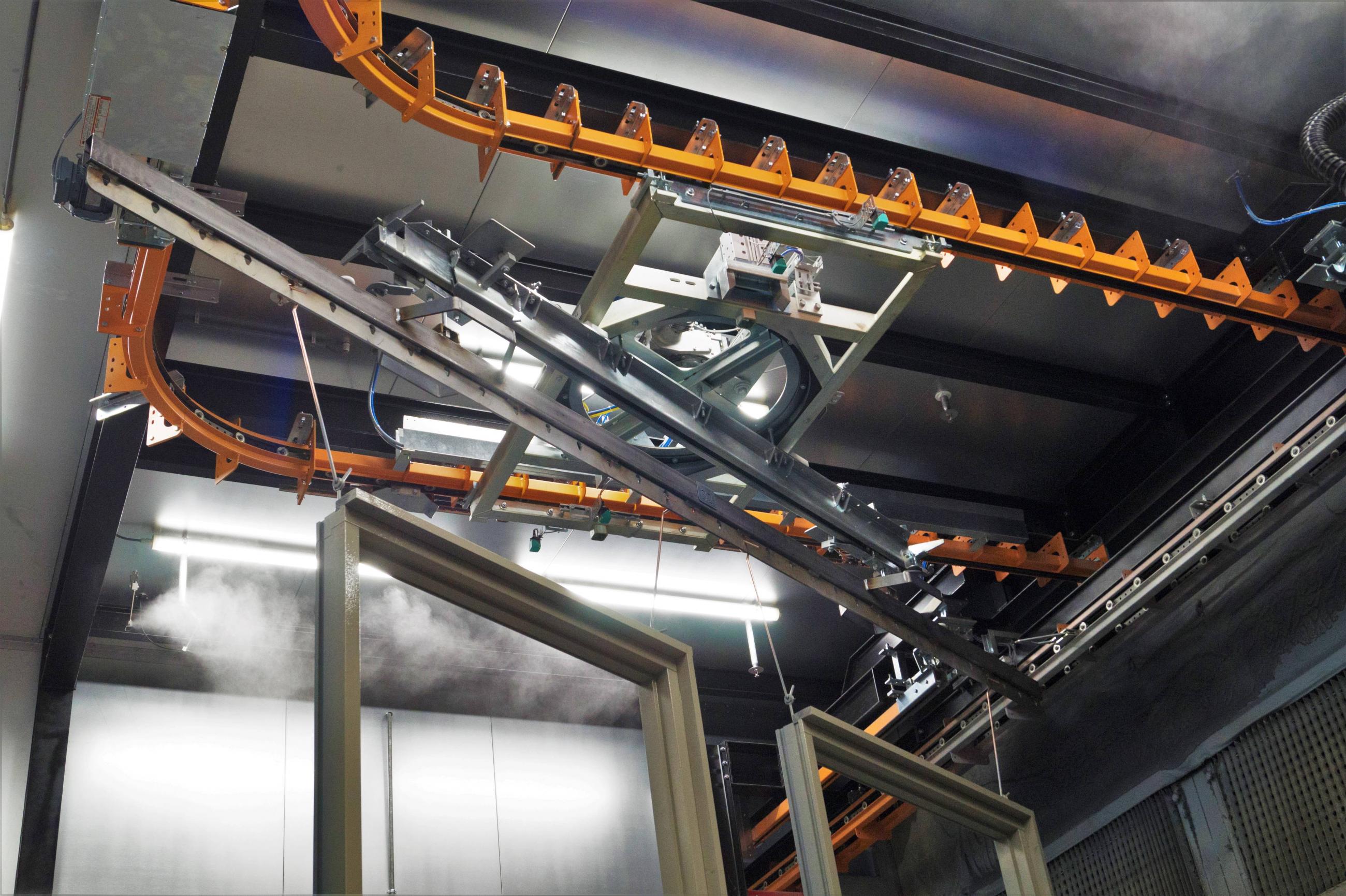 The section of rail carrying the product carrier detaches from the main rail, moves away from the extraction wall, rotates 180 degrees, and returns to the main rail so the robot can spray the other side of the product. This process is completely automated, thus saving a lot of effort and time.
